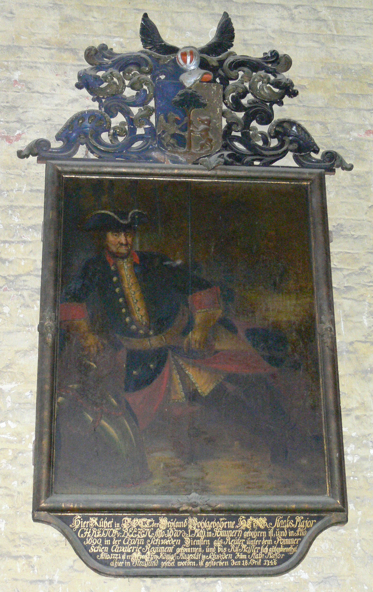 “Christoph Beetz (May 1, 1670, Swedish Pomerania – April 18, 1746, Straslund) was ennobled by Emperor Charles VI in Vienna, Austria on 27 January 1734 as “Beez von Beezen” (Beetz von Beetzen) after receiving an heritable membership of the old class of the Holy Roman Empire (higher nobility). His military career is highlighted by his command of a regiment at the age of 20 and his final appointment as Swedish Platz-Major and Stabs-Major of the military garrison in Stralsund. He was ranked as a Stadt-General. His 1746 portrait still graces the interior of Saint Mary’s Church, Stralsund, Germany (German: Kirche St. Marien zu Stralsund) where he is buried.