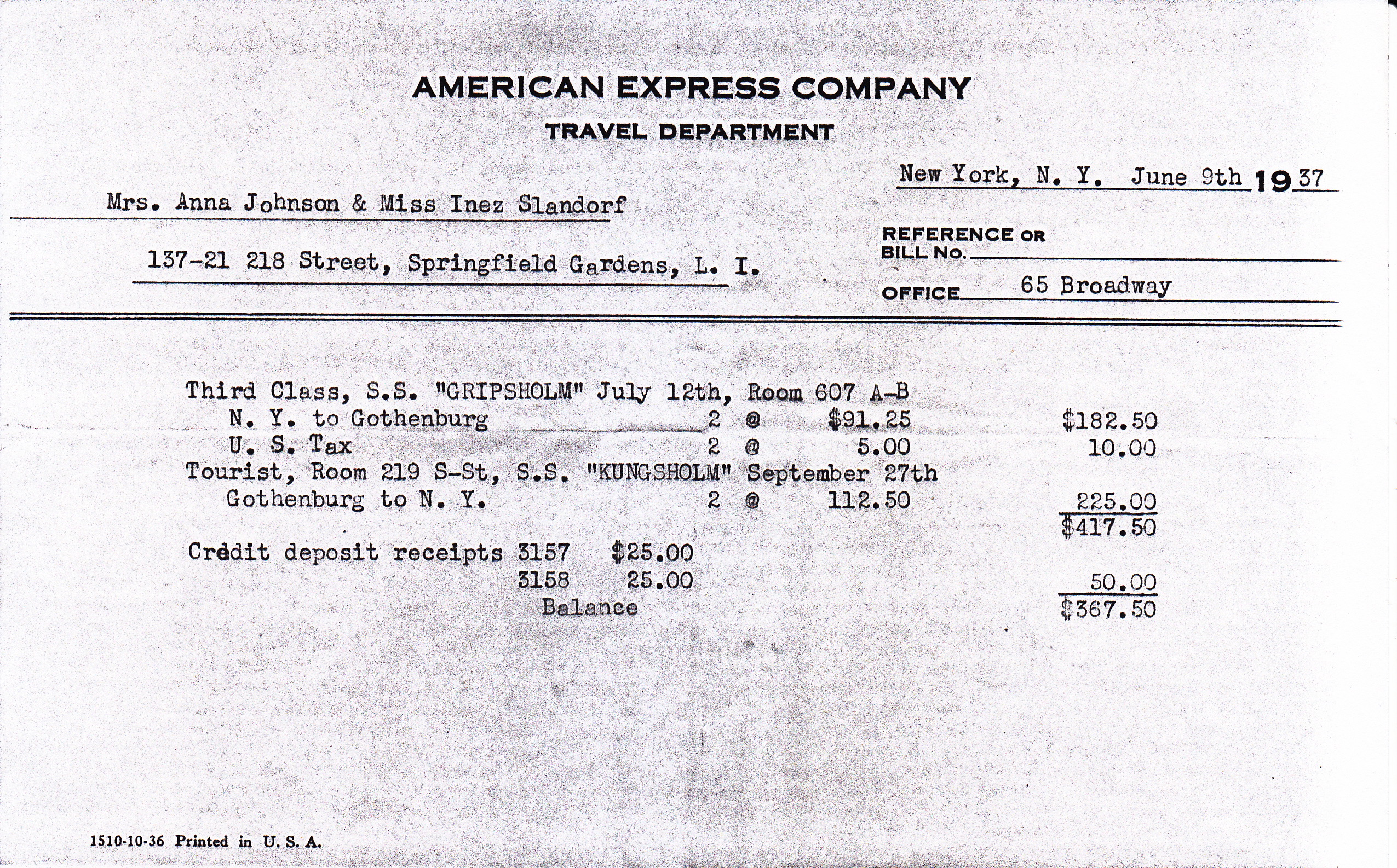 Anna and Inez traveled to Goteborg on the S.S. Gripsoholm on July 12, 1937.