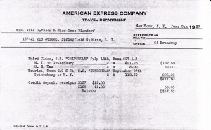 Anna apparently maintained her connections with the old country, as I know that, when she was 65 years old, she and her sister Inez Slandorf, nee von Bitzen traveled back to Goteborg, Sweden on at least one occasion via ocean liner. Records show that she booked passage through the American Express Company on a round-trip to Goteborg, Sweden (spelled Gothenburg on the receipt).