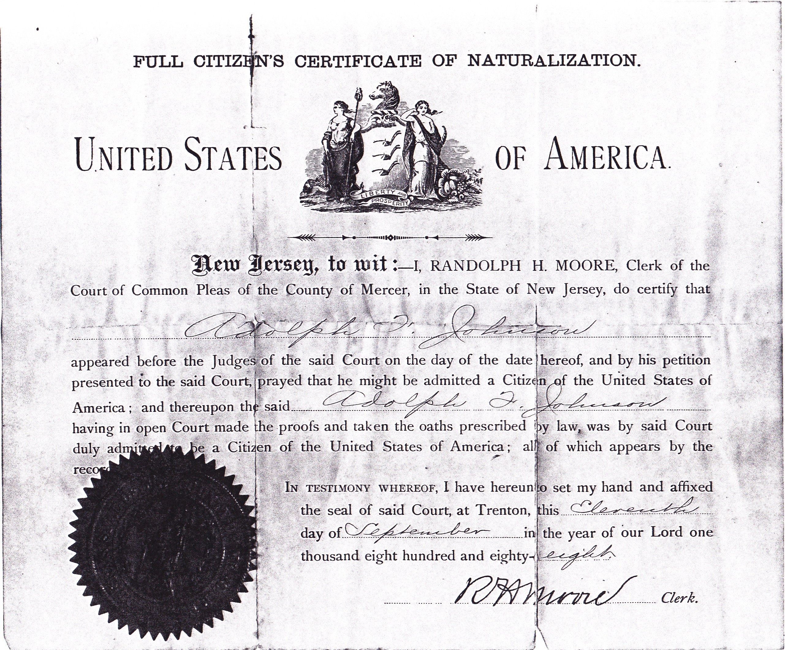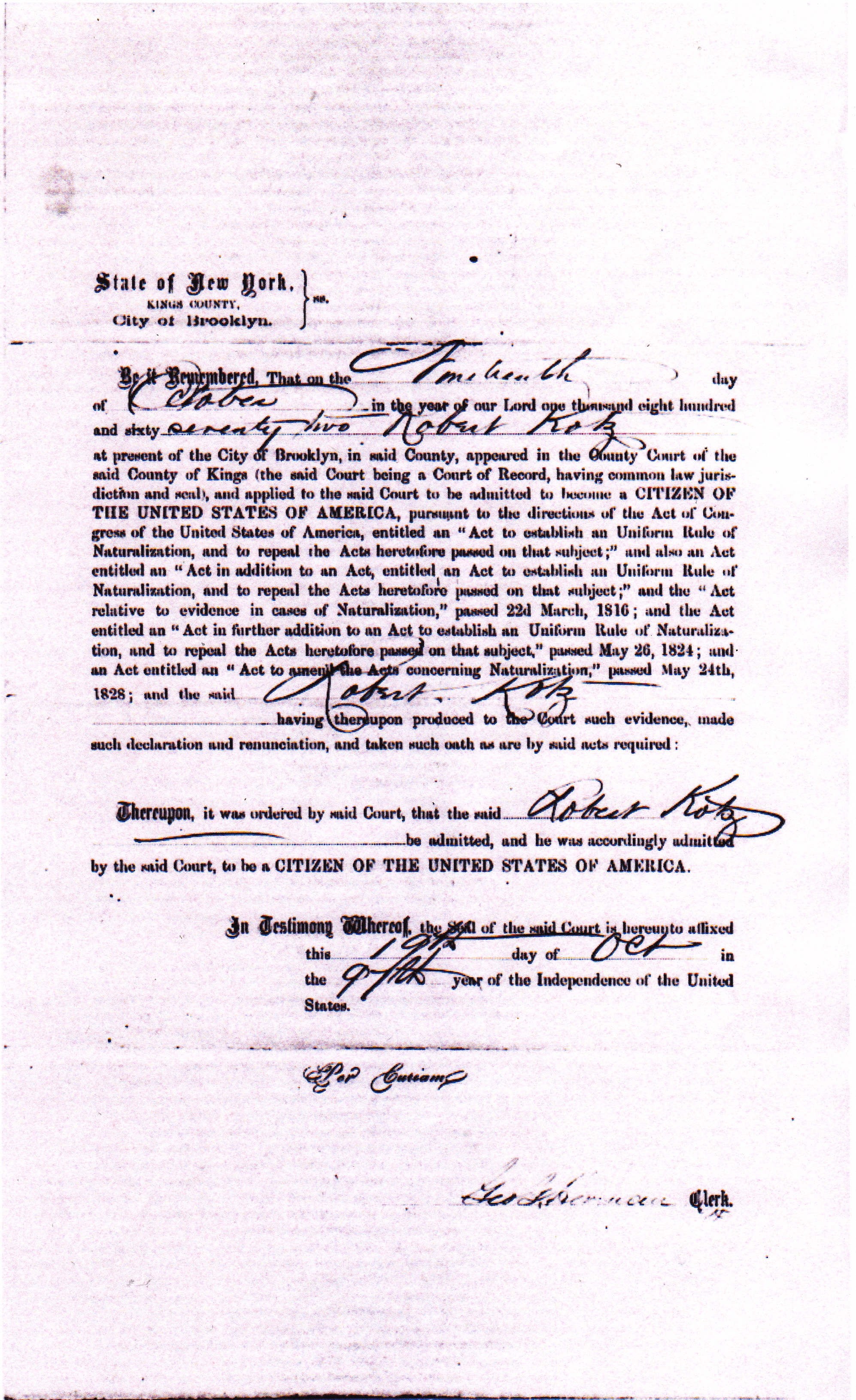 Robert John Kotz was born in Germany and emigrated to America. I’m not sure when he came to the United States but I know he was naturalized as an American citizen on Oct. 9, 1872. See naturalization papers below:
