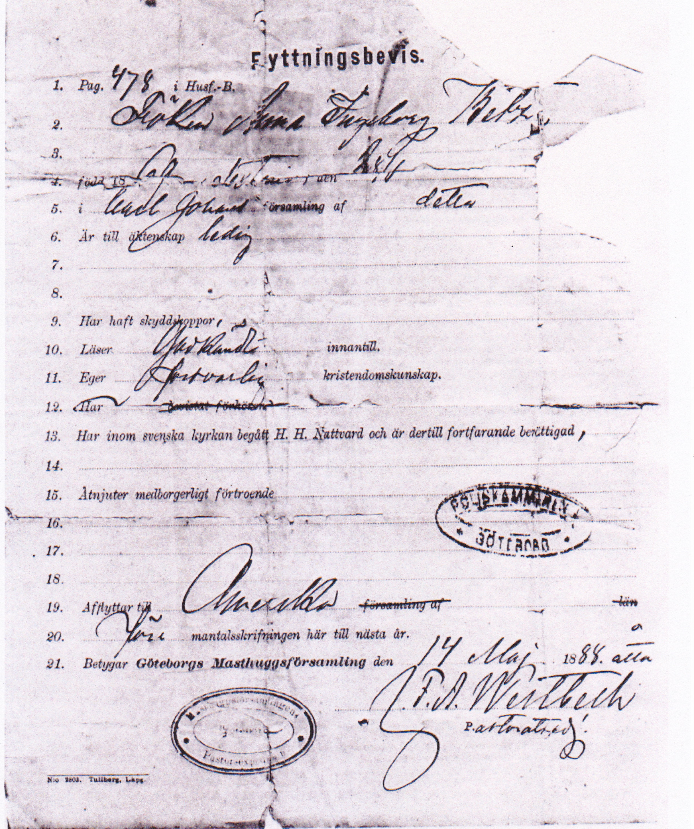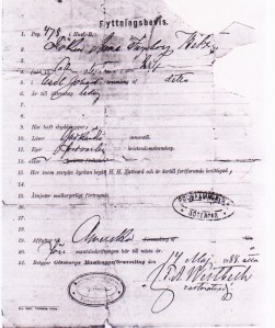 Anna emigrated to America in 1888. Like her future husband, she was 16 years old at the time of passage. I’m pretty sure she came over with her family, as I’ve seen pictures of her with her sisters in America. Below is her Swedish “Flyttningsbevin” (“transfer evidence”) or passport issued on May 14, 1888: