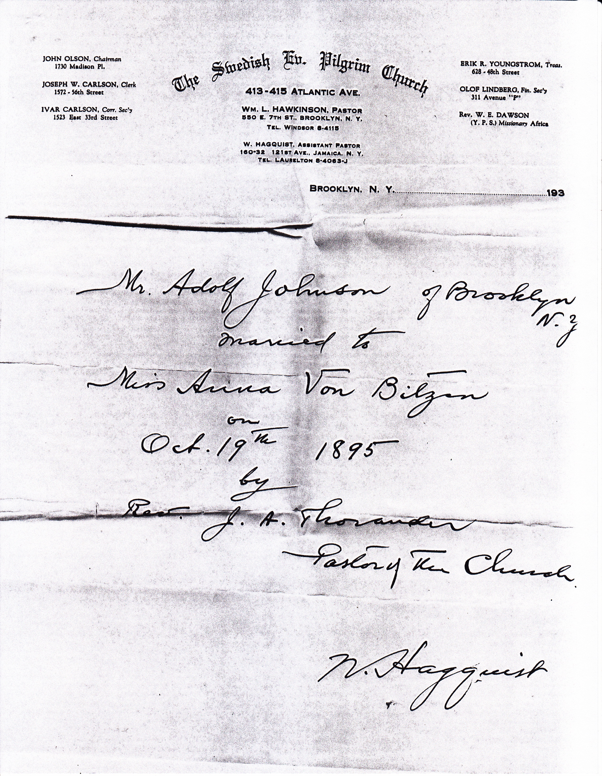 On October 19, 1895, Adolph married Anna Ingaborg von Bitzen at the Swedish Evangelical Pilgrim Church on Atlantic Avenue in Brooklyn, New York.