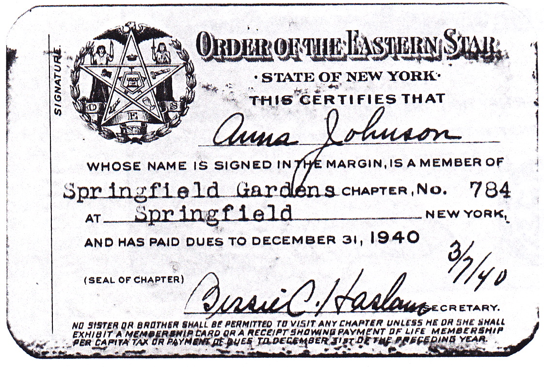 A friend of mine who is a Freemason offered to see what information he could get from the OES (Order of the Eastern Star) lodge. The Springfield Gardens, N.Y., Chapter is no longer active, but he was able to find out through the mother organization that her Masonic sponsor was K.W. Johnson of the Plymouth Lodge 1004, Brooklynn, N.Y. (K.W. Johnson was Karl Johnson, Esther Adele Kotz, nee Johnson’s — Nonnie’s mother’s — sister.) The interesting thing is the question of involvement by members of the Johnson family. Anna is from Sweden, and the Swedish rites of Freemasonry generally counted nobility among its members, especially in the earlier years.