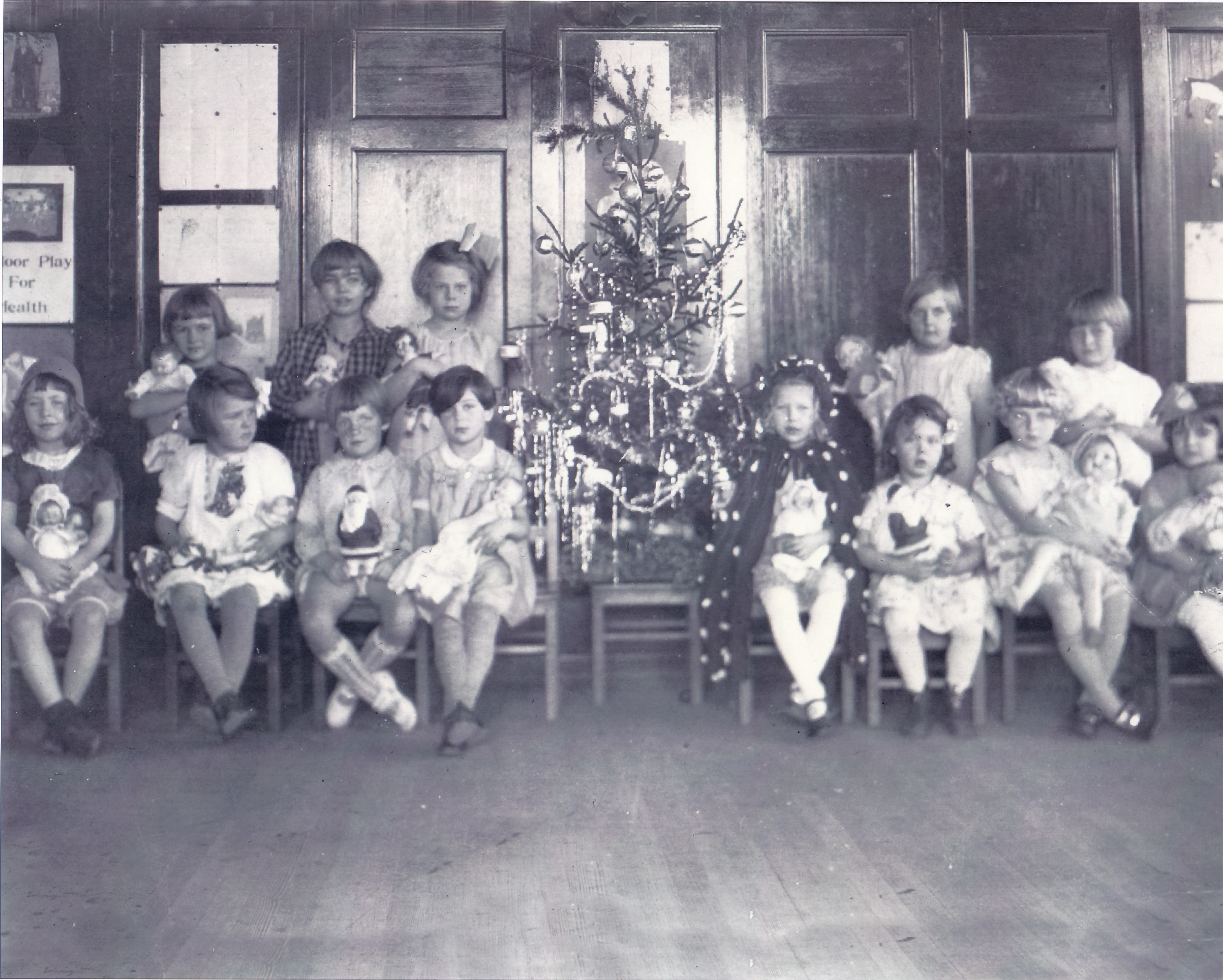 Here is a picture of Nonnie in kindergarten with her sister Gloria. Nonnie is standing in the back, third from the left, next to the Christmas tree. Her sister Gloria is seated fifth from the left, next to the Christmas tree, wearing a kind of Little Red Riding Hood outfit.