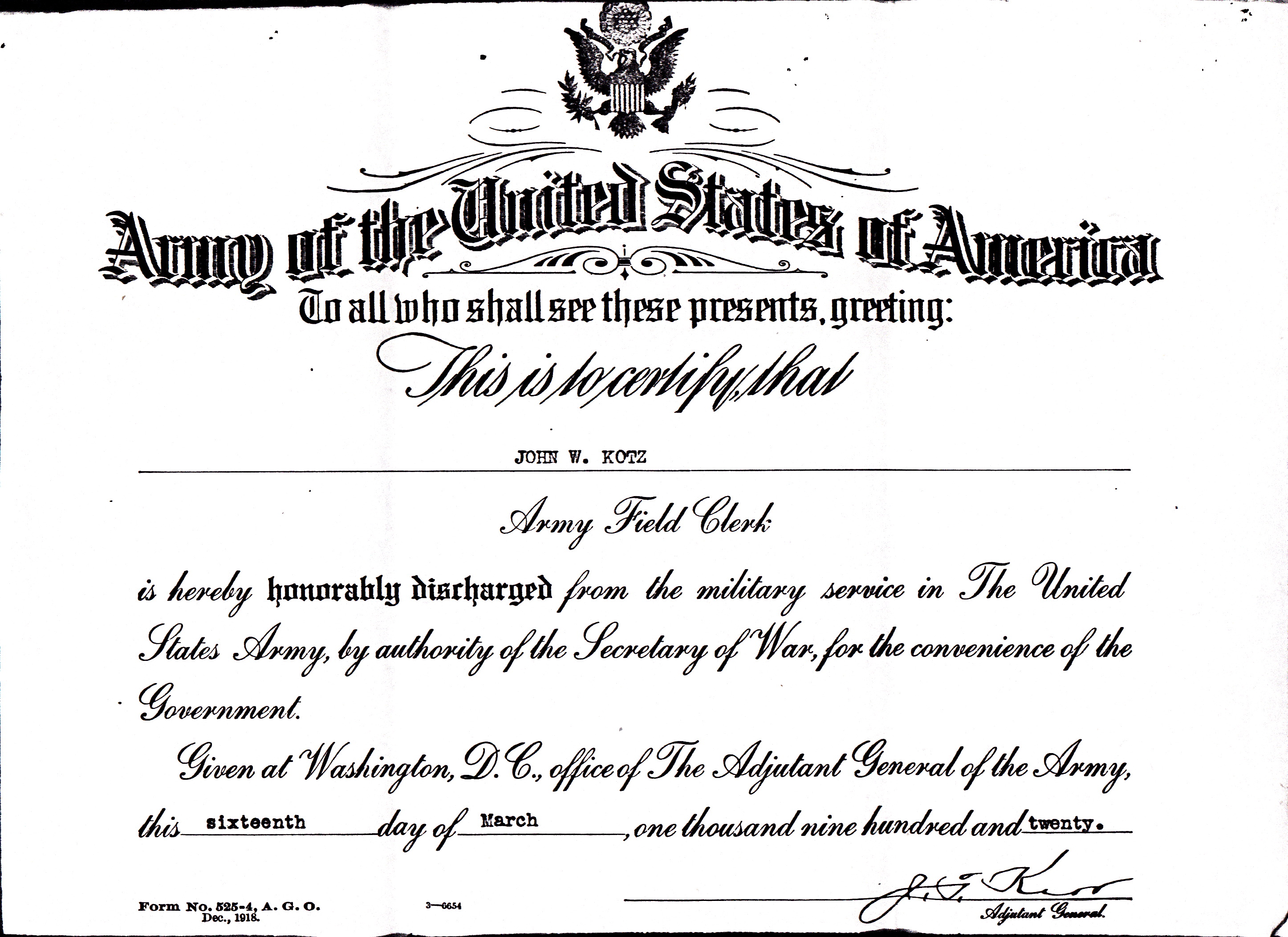 He served there until October 21, 1918, when received an Honorable Discharge to serve in the regular U.S. Army where he was commissioned as an Army Field Clerk.