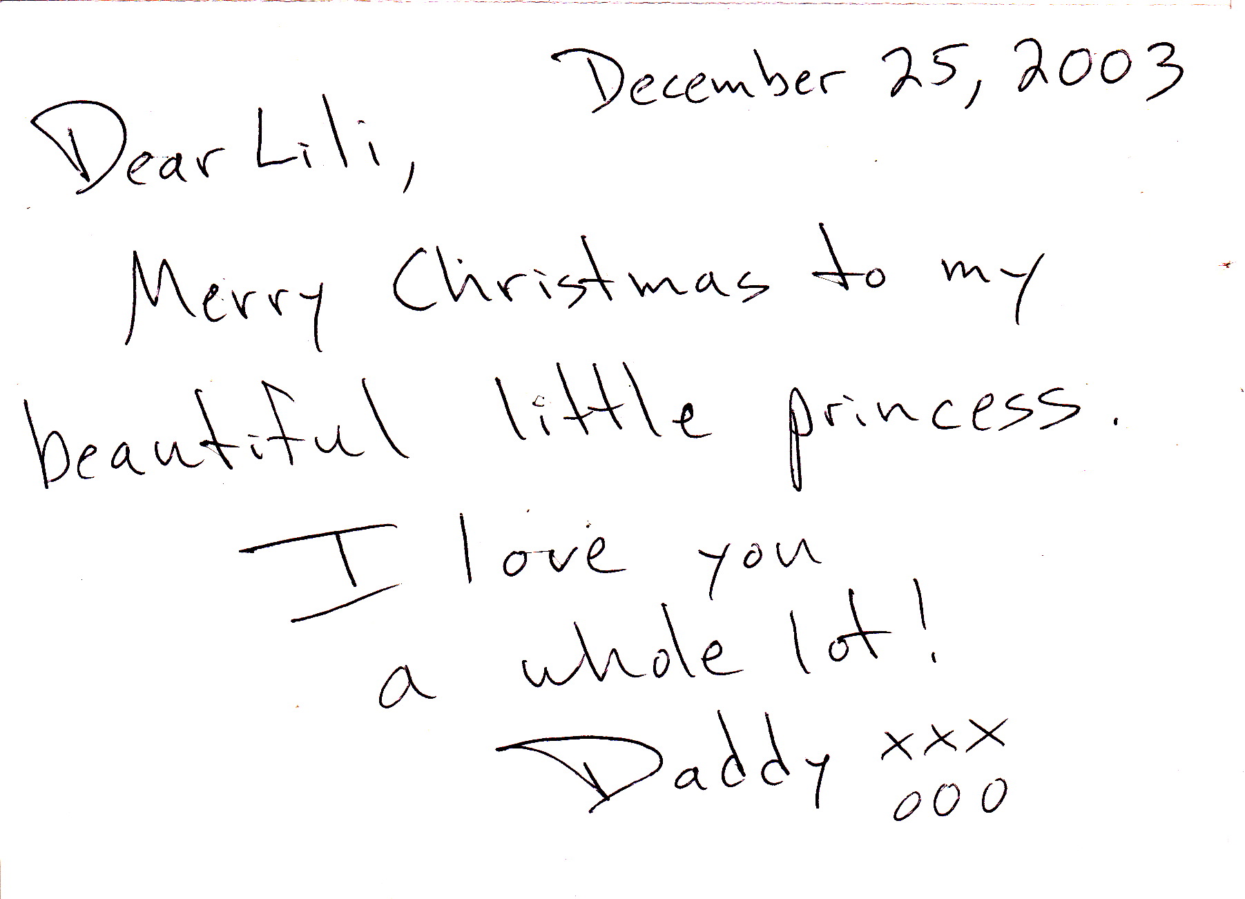 Christmas 2003 was to be the last Christmas we ever spent together. About two months earlier I started getting messages from your mother every time I asked to see you that said “Lili doesn’t want to see you.” Christmas 2004 was not to be. I was really pretty sad around this time and had to get away from Japan for a while, so I booked a trip to Koh Samui, Thailand, where I spent Christmas and New Year’s that year.