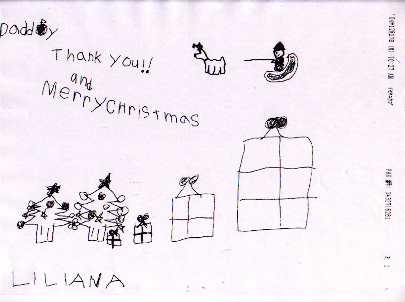 But just as I was leaving the house for the airport, the phone rang. Somebody was trying to send a fax. At first, the fax jammed and the fax didn’t come through. But I fixed the paper and the phone rang again. This is what I got — a Merry Christmas fax from you!