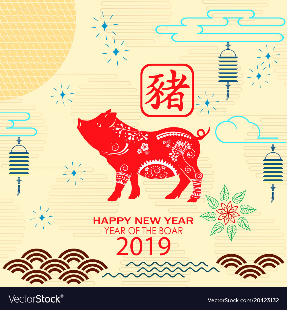 Happy Chinese new year 2019 card with pig. Vector illustration.